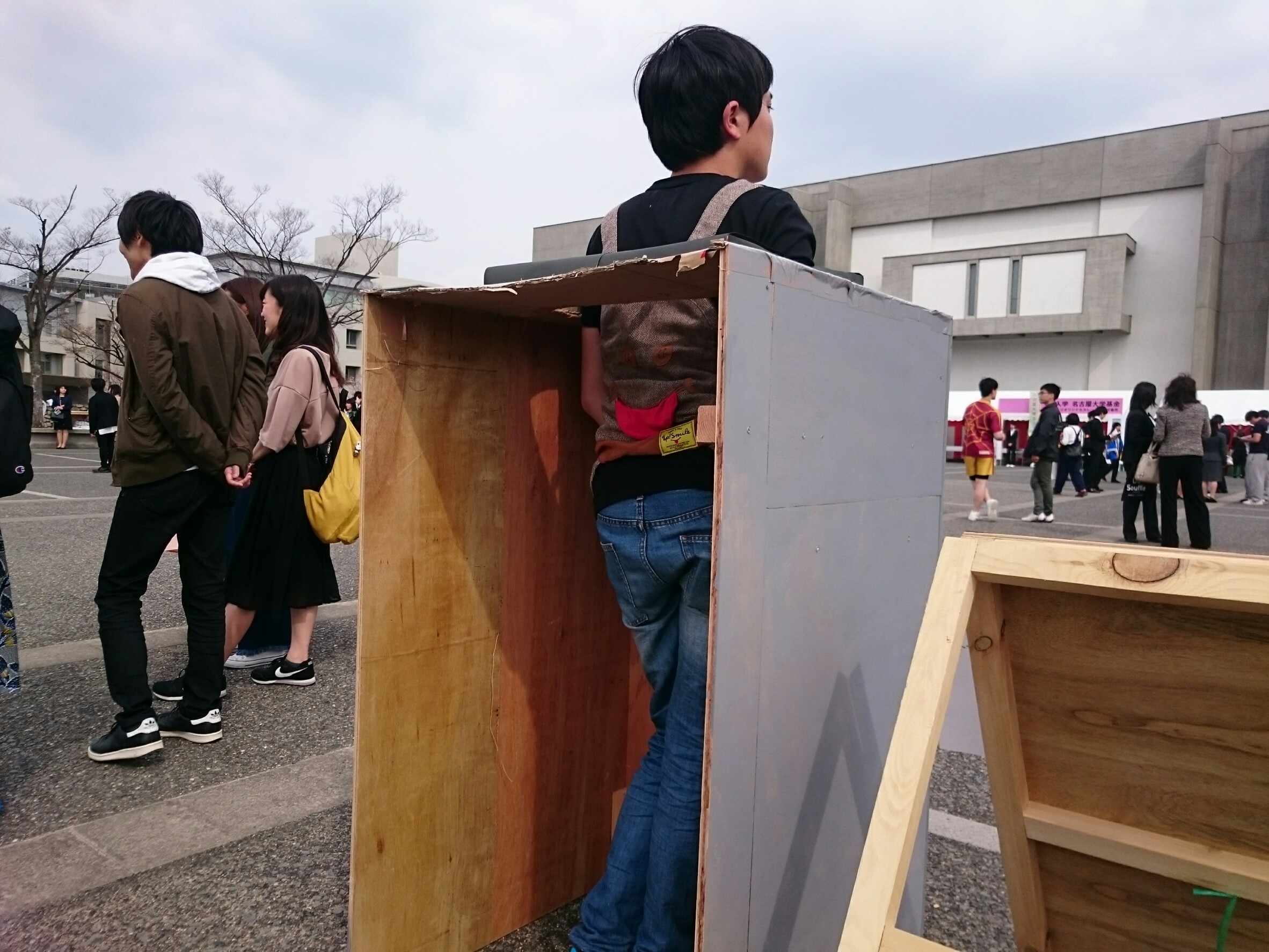 2017年度名古屋大学の入学式会場で、福沢諭吉のように銅像になれる装置を設置しました。