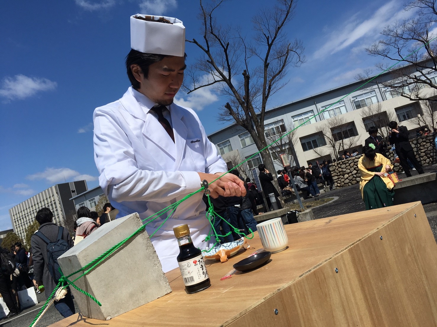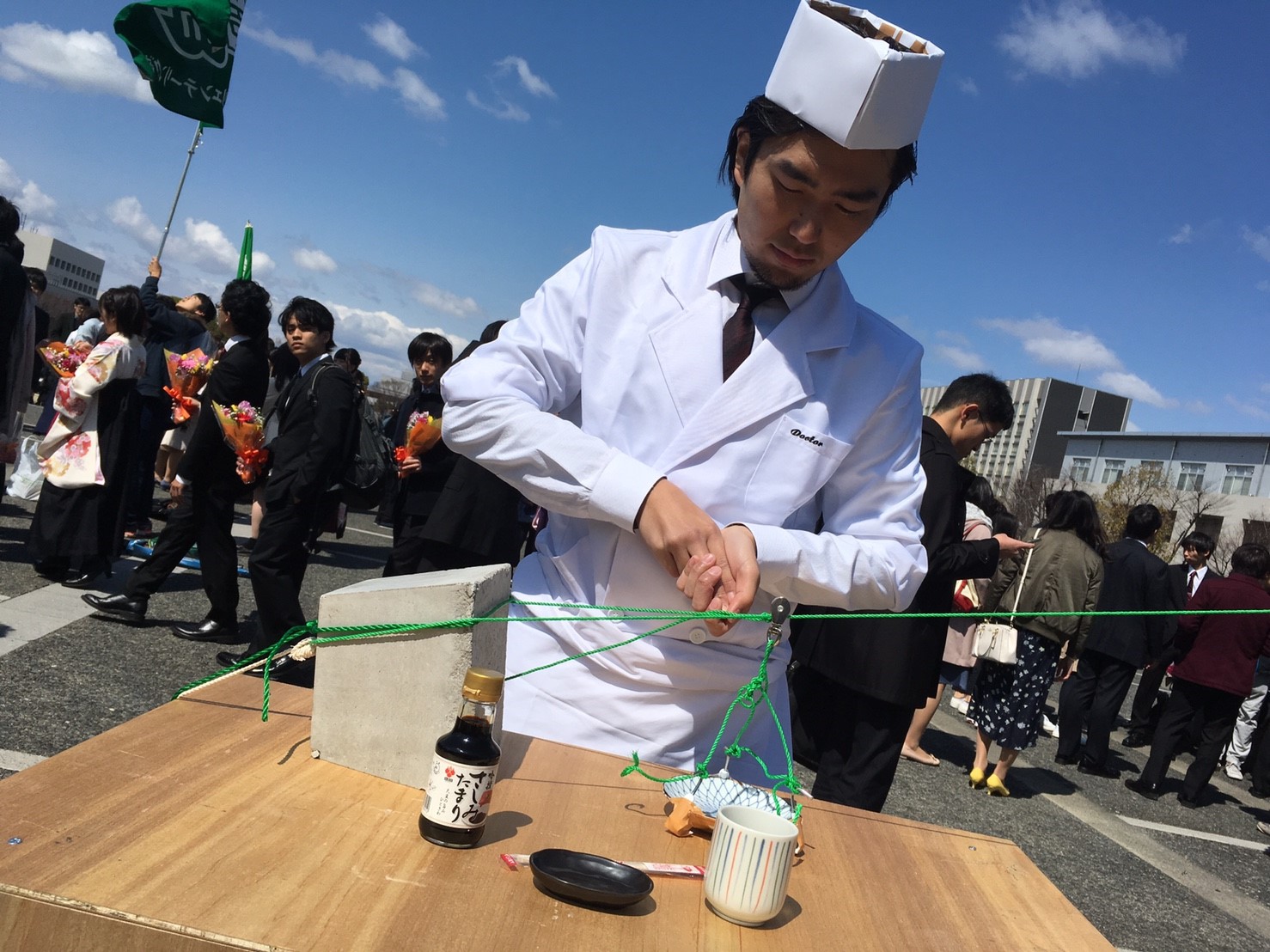名古屋大学の卒業式にて「空飛ぶ寿司屋」をオープンしました。空飛ぶ寿司屋は卒業生をお祝いするためのとくべつな寿司屋です。