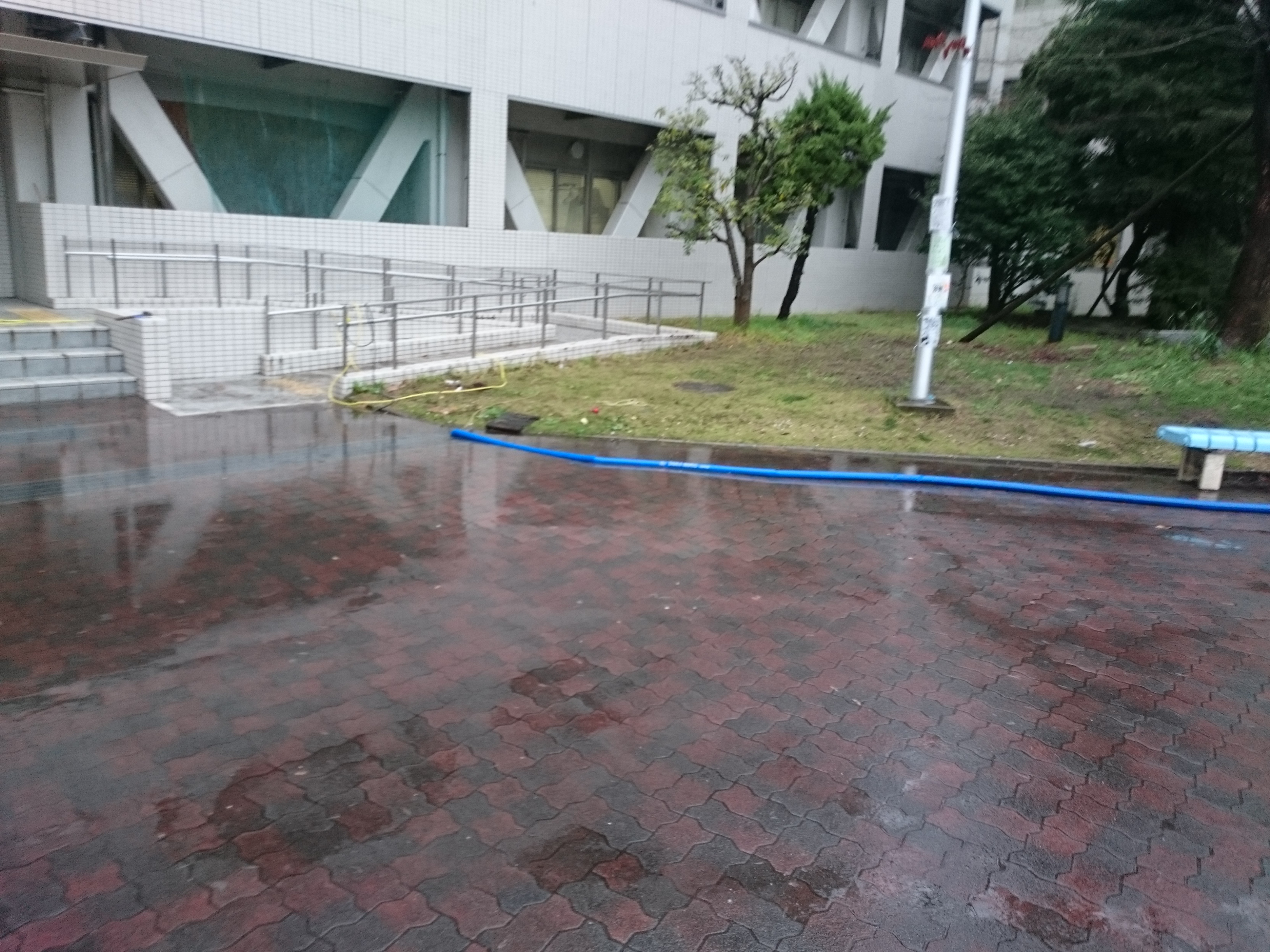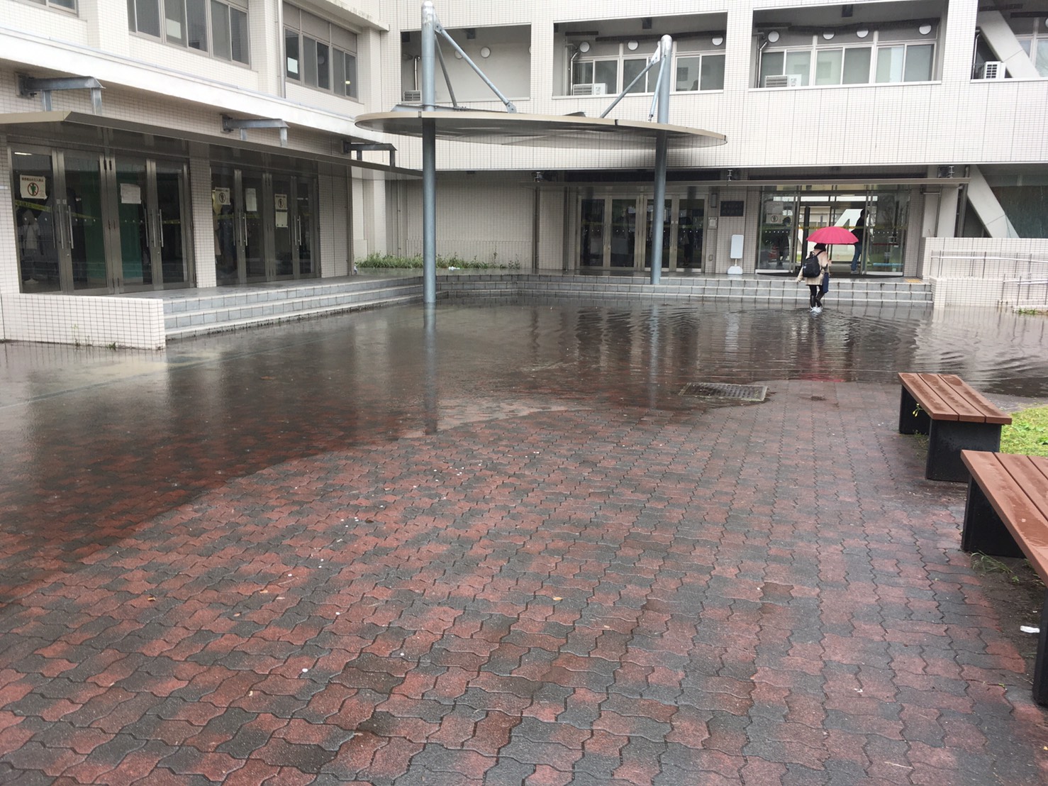 この日は新入生にとってのはじめての授業日なのにもかかわらず、建物前が池になってしまっていて大変でした。午前中のほうが雨が激しく、池はもっと巨大だったようです。