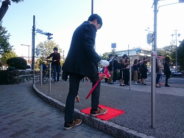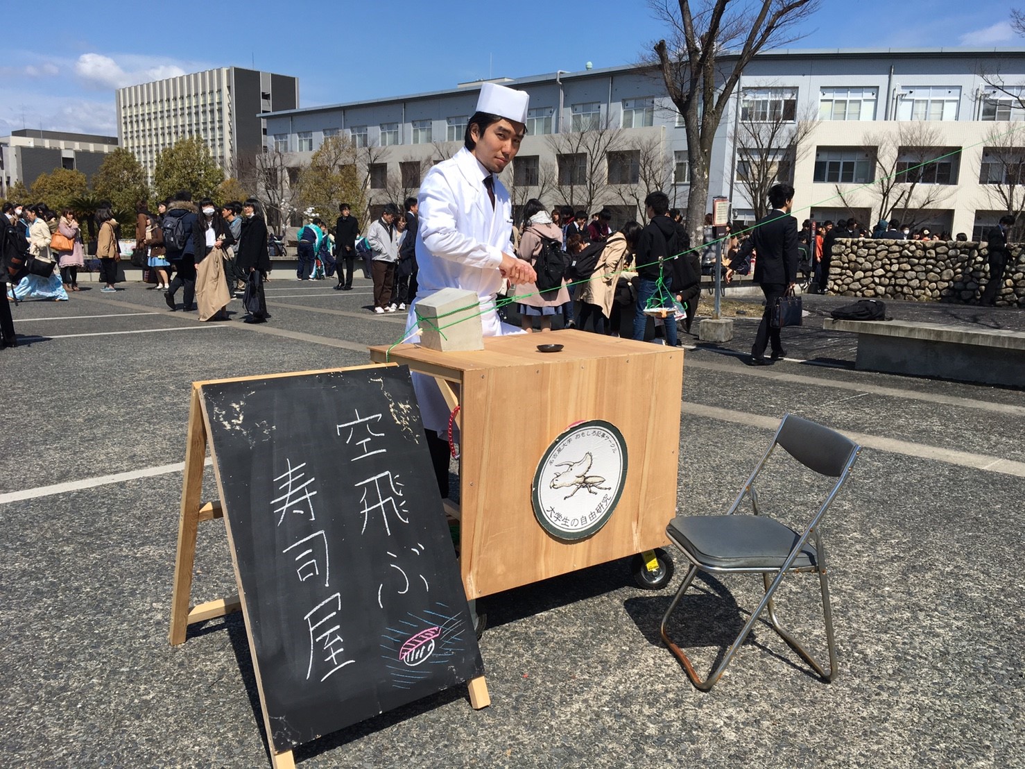 名古屋大学の卒業式に空飛ぶ寿司屋をオープンしました。ロープウェイで寿司が空を飛んできます。