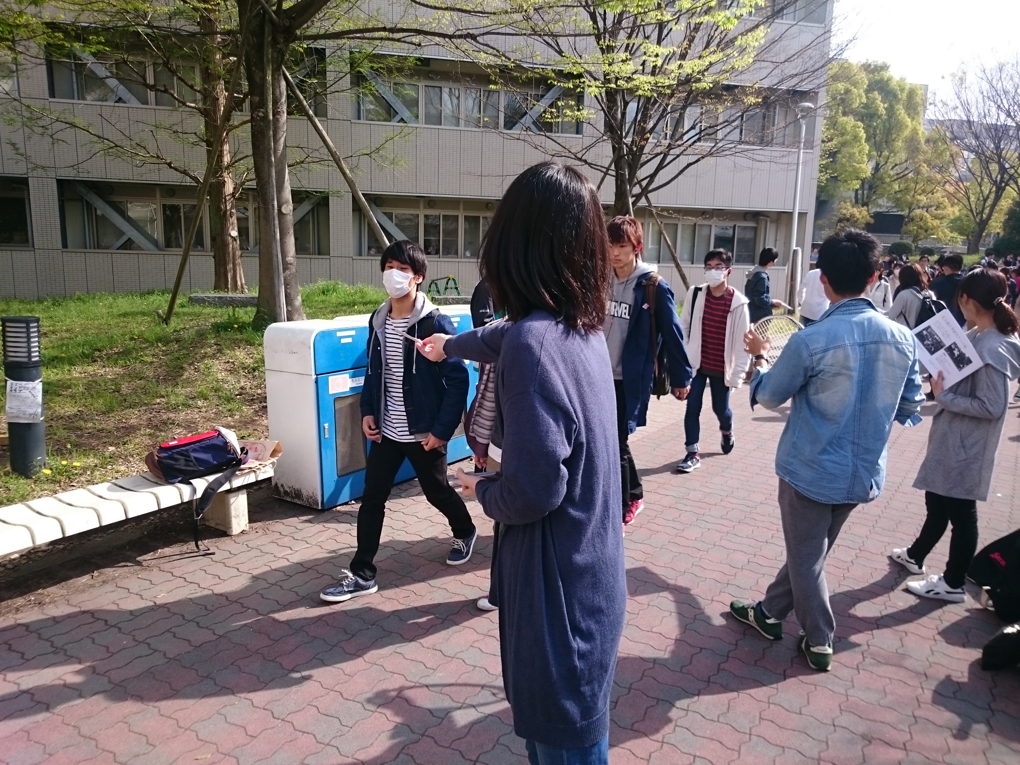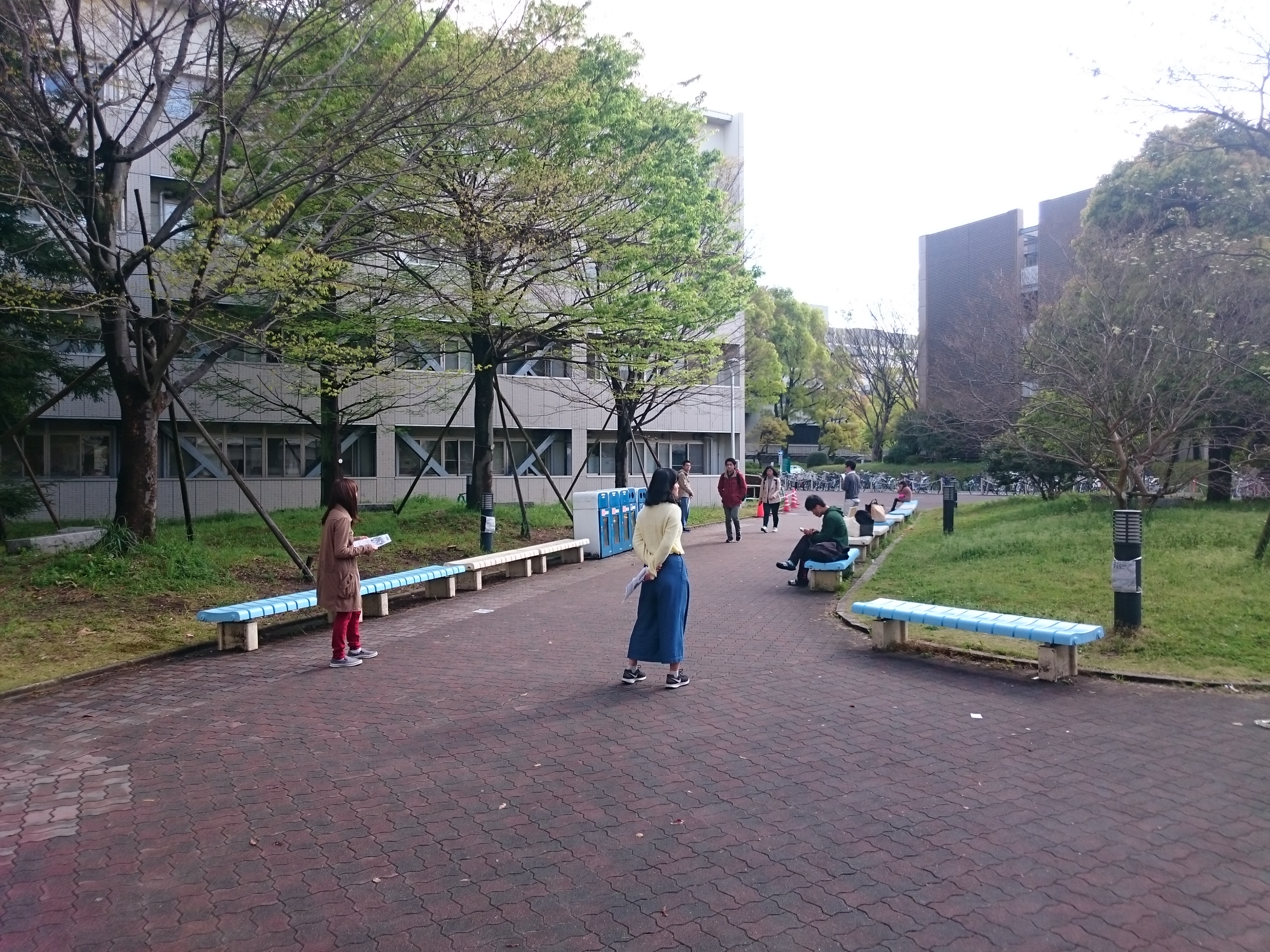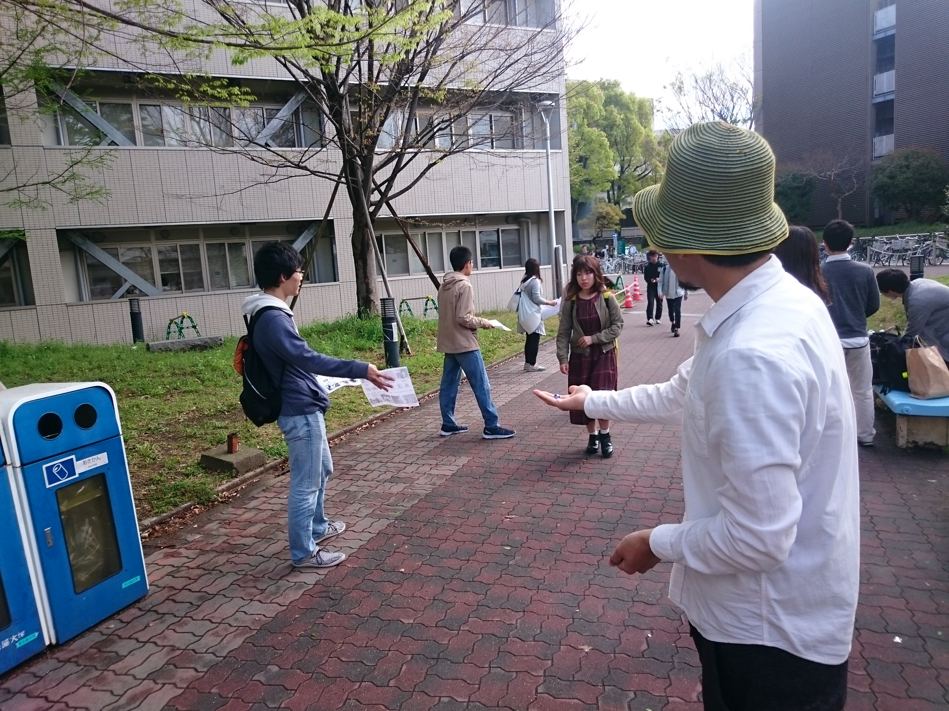 場所は「名古屋大学全学教育棟前」という、新入生がもっとも通るスポット。先日雨で池になっていた場所である。新学期がはじまってすこし経っていたのでビラ配りの人はそんなにたくさんはいなかったが、いま名大でもっともうかれているのはここで間違いない。