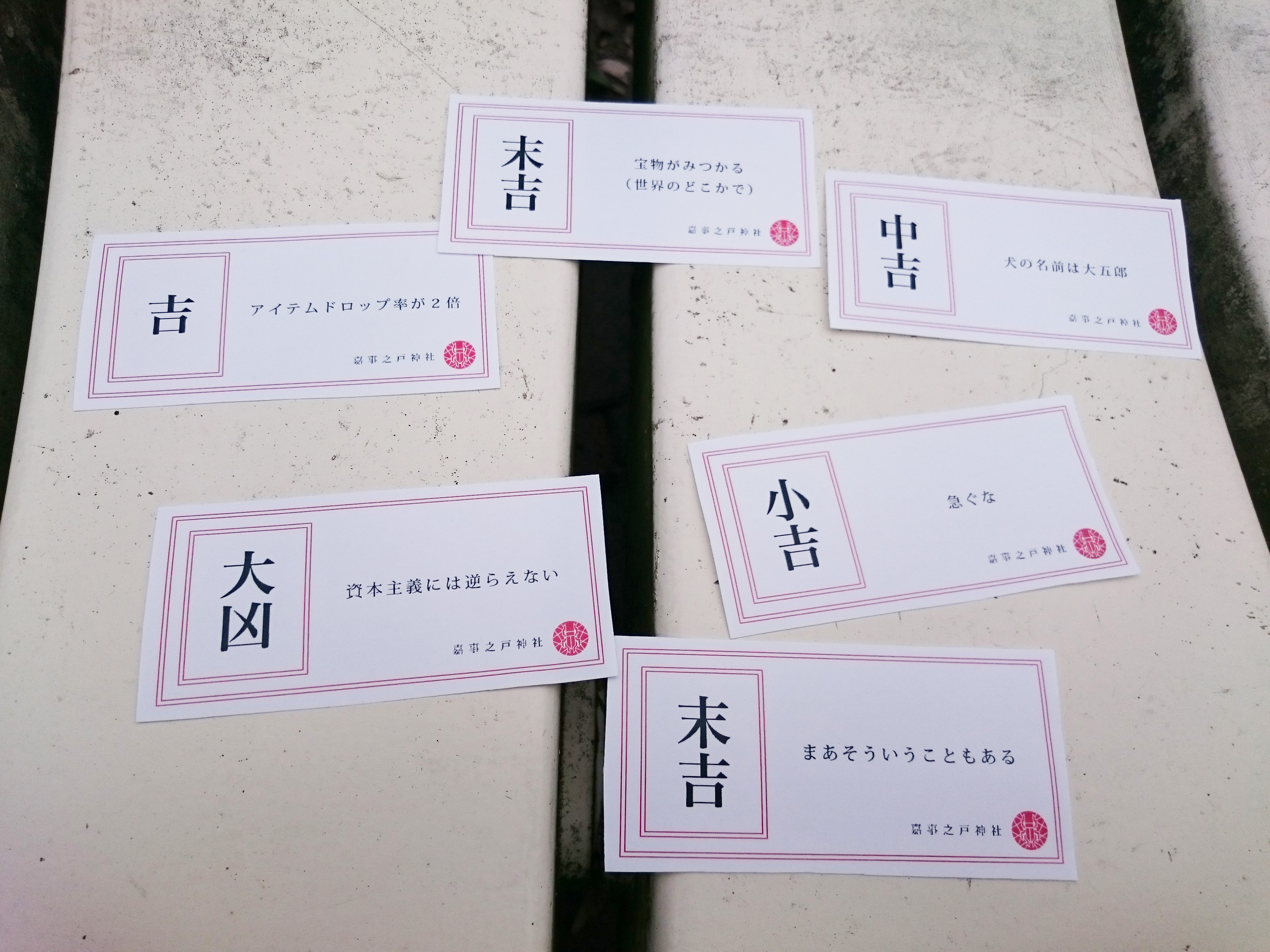 さいごはおみくじ。もらってから中を見る楽しみがある。ふうせんは邪魔だといってあとで返しにきた人もいるくらいだったけど、おみくじでそれはやめてほしい。凶ばかり僕の手元にたまって不幸になるから。