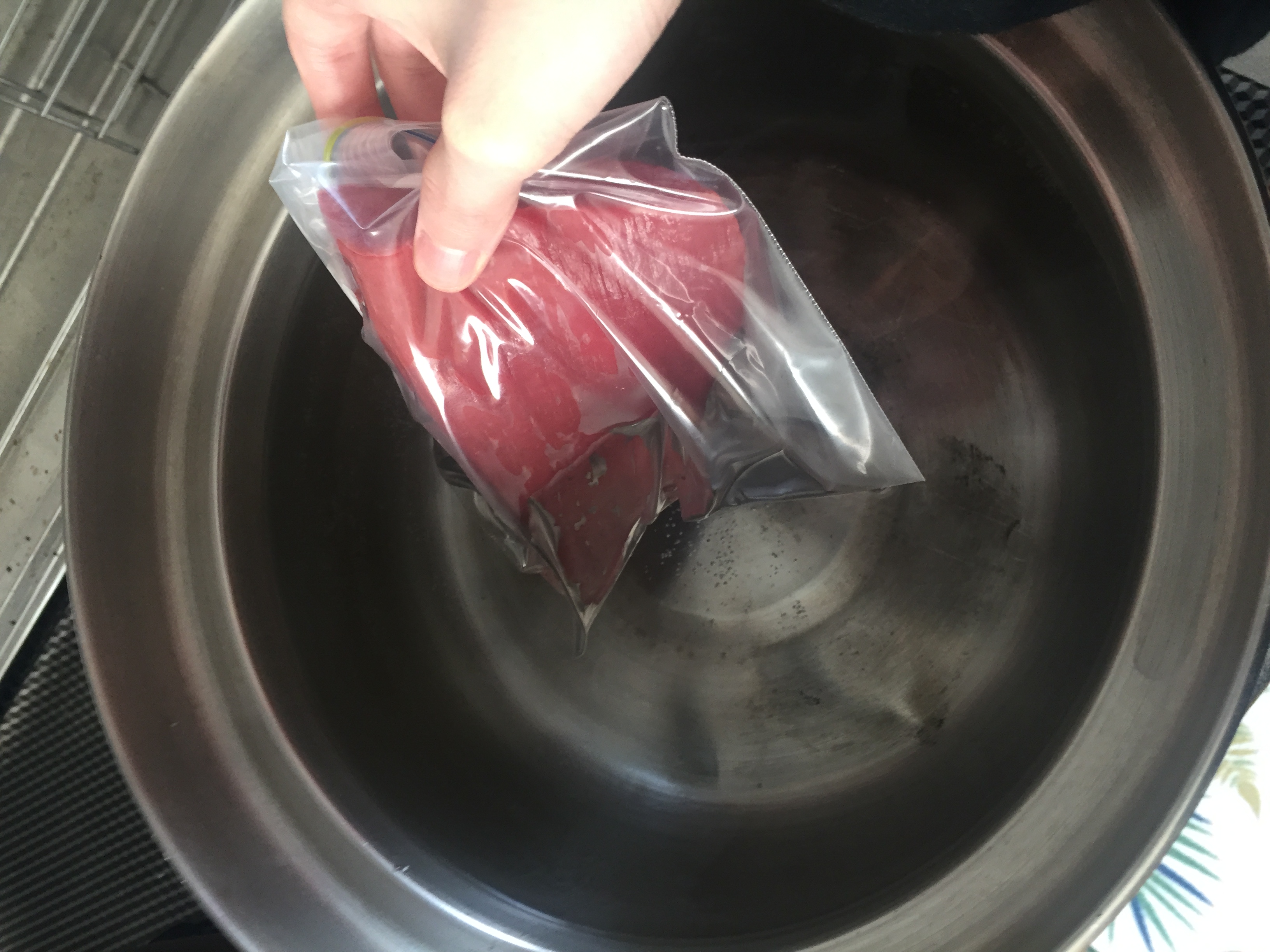 45分経ったのでお湯から肉を取り出し、全体に焼き目をつけました。この辺りで僕のテンションは最高潮に達し、焼き目をつけながら「うわー、かわいいー」「焼きまーす」などと大きな声で独り言を言っていました。側から見れば心が壊れた男としか思われないでしょうが、僕自身はどんどん心が豊かになっている最中なので問題ありません。